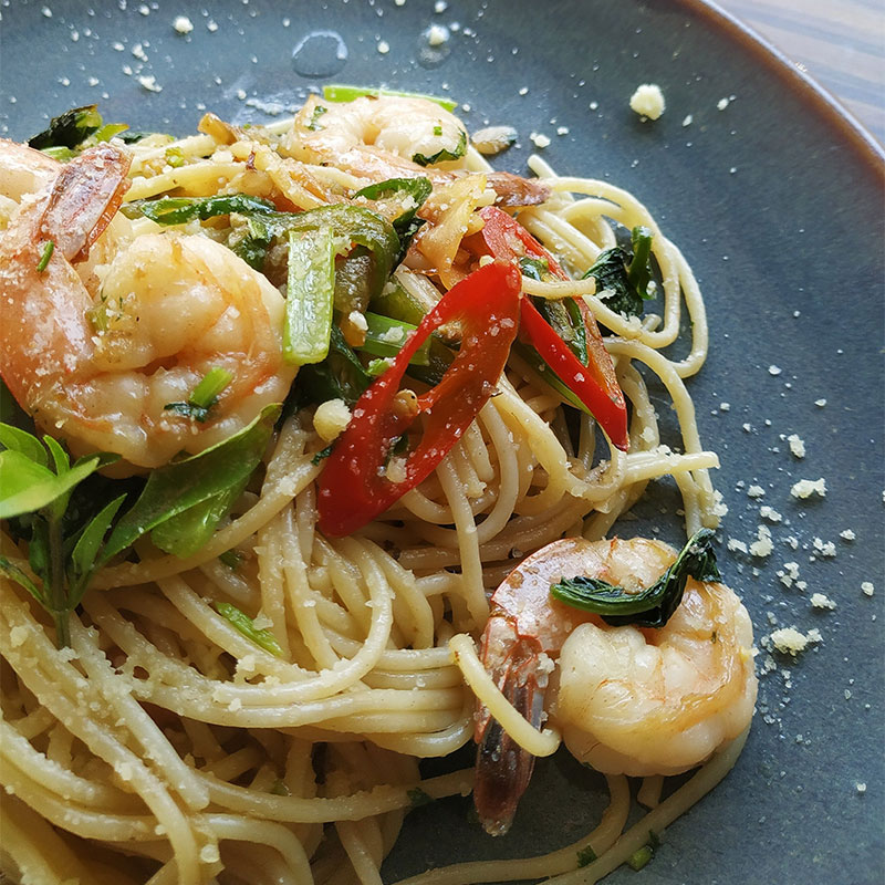 | Spagettitészta fokhagymás, tejszínes, gombás, sonkás mártással, reszelt sajttal tálalva. | ||